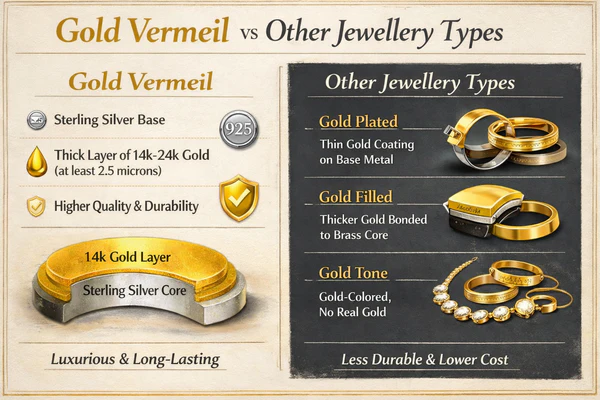 In contrast, the 18ct gold vermeil on silver meaning highlights a superior jewellery category due to its sterling silver base and thicker gold coating. This combination not only improves durability but also enhances the overall appearance and feel of the jewellery, making it a preferred choice for long-term wear.